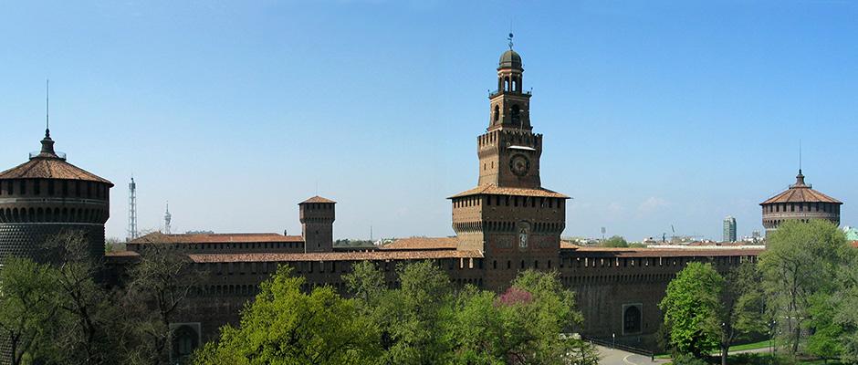 Castello Sforzesco เดิมเป็นป้อมปราการขนาดใหญ่ และต่อมาเป็นบ้านของผู้ปกครองของมิลานซึ่งเปลี่ยนให้เป็นวังของขุนนางอันงดงาม ได้รับการตกแต่งโดยศิลปินที่ยิ่งใหญ่ที่สุดในยุคนั้นรวมถึง Donato Bramante และ Leonardo da Vinci จึงเป็นแหล่งรวมผลงานศิลปะประวัติศาสตร์ไว้อย่างมากมาย